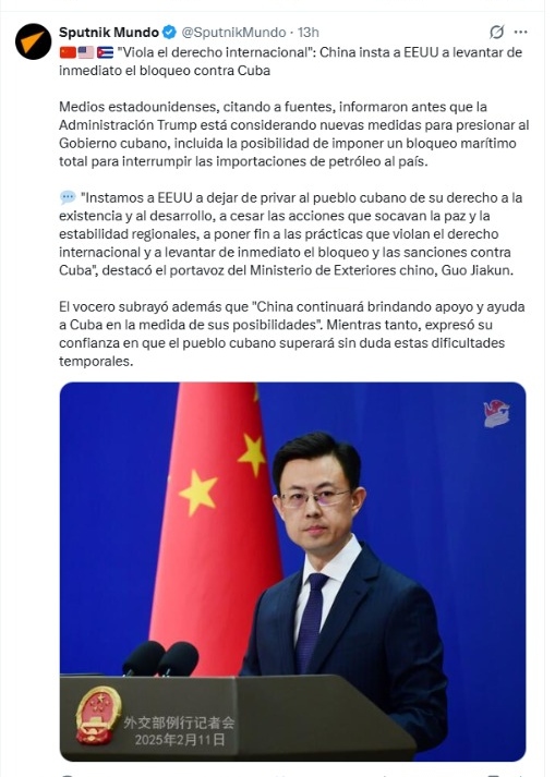 «Instamos a EEUU a dejar de privar al pueblo cubano de su derecho a la existencia y al desarrollo, a cesar las acciones que socavan la paz y la estabilidad regionales, a poner fin a las prácticas que violan el derecho internacional y a levantar de inmediato el bloqueo y las sanciones contra Cuba», destacó el portavoz del Ministerio de Exteriores chino, Guo Jiakun.